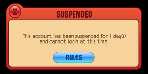 In some instances, a Jammer may get away with causing infractions in-game, only later get suspended. If the player tries to log on, a notice will come up saying the account is suspended. A bulletin is likewise sent to that Jammer's parent'due south account. This typically occurs when the histrion is reported multiple times or traced by a moderator, as swearing and scamming are the only two that volition immediately log a player off.